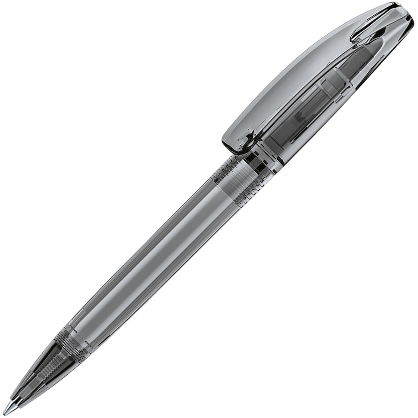 Gennemsigtig kuglepen i flot design. Kuglepennen har vridemekanisme og fås i flere flotte farver. Fås med enten blåt eller sort blæk.