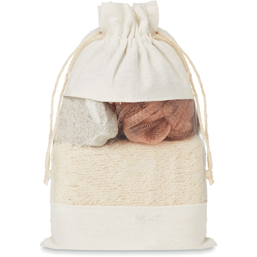 Sæt med badesvamp, badesten og badepuf. Trykket lave på gaveposen.