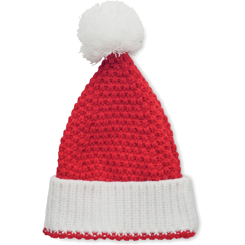Strikket nissehue i miljøvenligt rPET. Huen er af ret kort model. Mærkning laves med brodering.