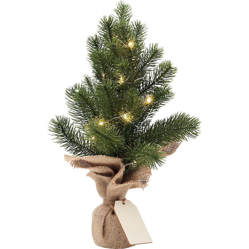 Kunstigt juletræ i miniformat. Juletræet er oplyst af 20 stk. LED-lys og står i en julesæk af jute. Trykket laves på en etiket af træ. Perfekt til kontoret!