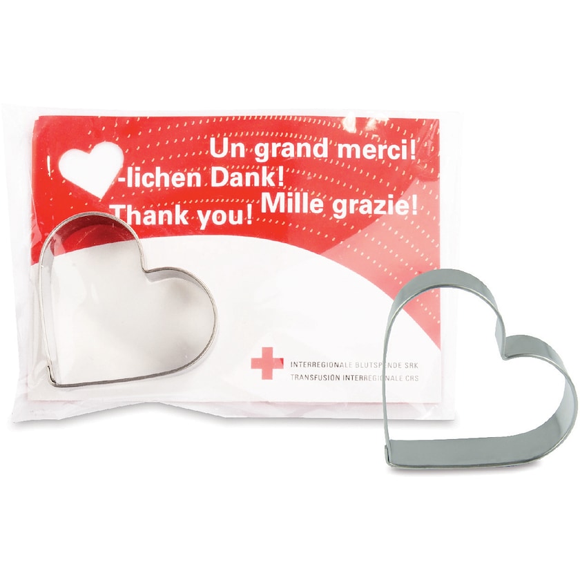 Hjerteformet kageform i PE-pose med digitaltrykt papirindlæg. Papirsindlægget trykkes på begge sider. Et hjertelig reklameprodukt med stor reklameværdi!