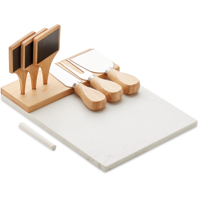 Ostesæt i marmor og bambus med tilhørende osteknive og skilte. En luksuriøs gave til alle osteelskere. Skiltene gør at du let kan præsentere de forskellige oste og snacks. 1 stk. kridt følger med. Leveres i en gaveæske. Lasergravering laves på bambusdelen.
