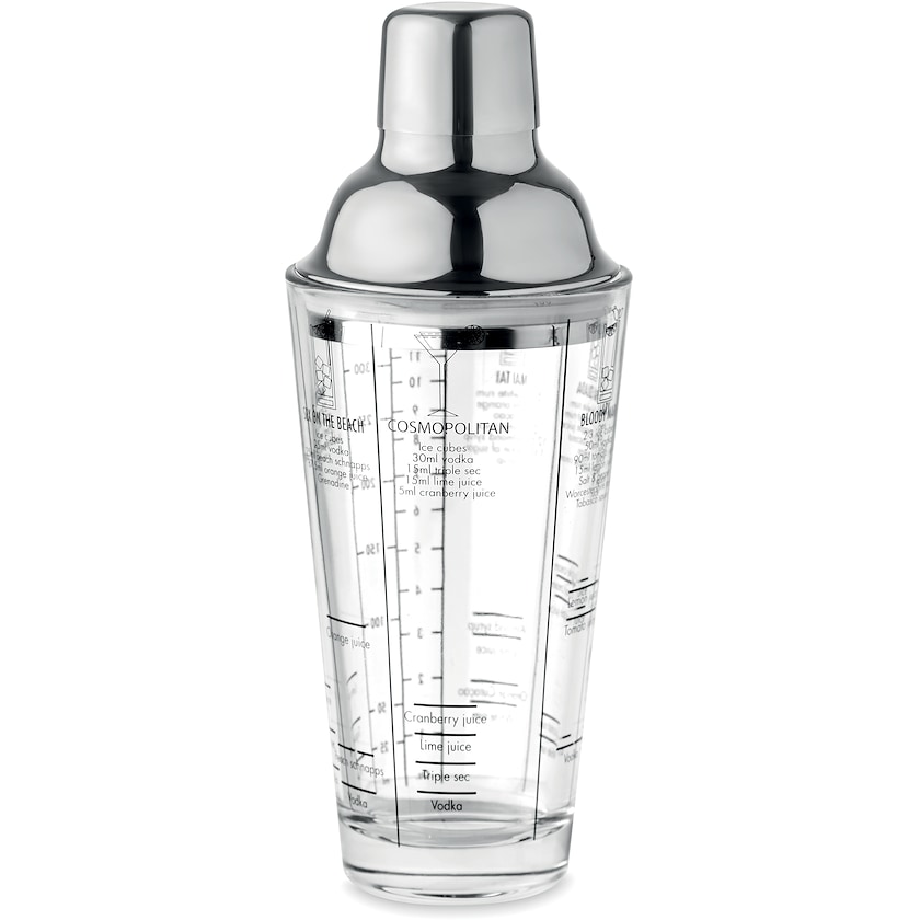Cocktailshaker af glas med låg af rustfri stål. Cocktailopskrifter og mål er trykt på glasset. En perfekt gave til alle, der kan lide gode drinks.