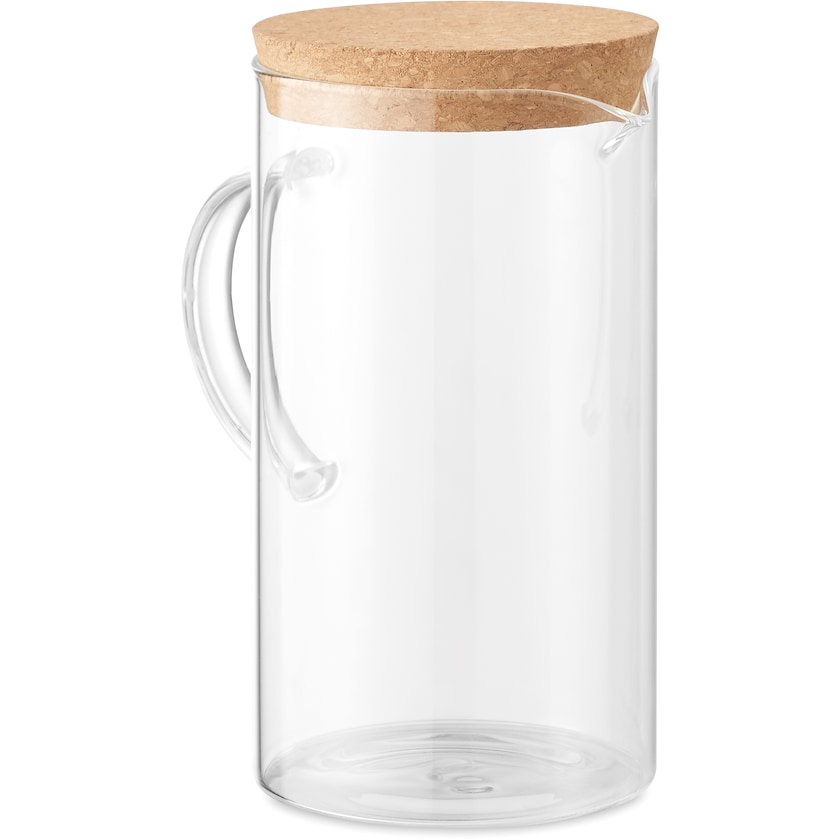 Glaskande med låg i kork. En pæn glaskande i solidt borosilikatglas som både tåler varme og kolde drikkevarer. Perfekt til et veldækket bord. Kun 1-farvetryk. Lasergravering laves på korken.