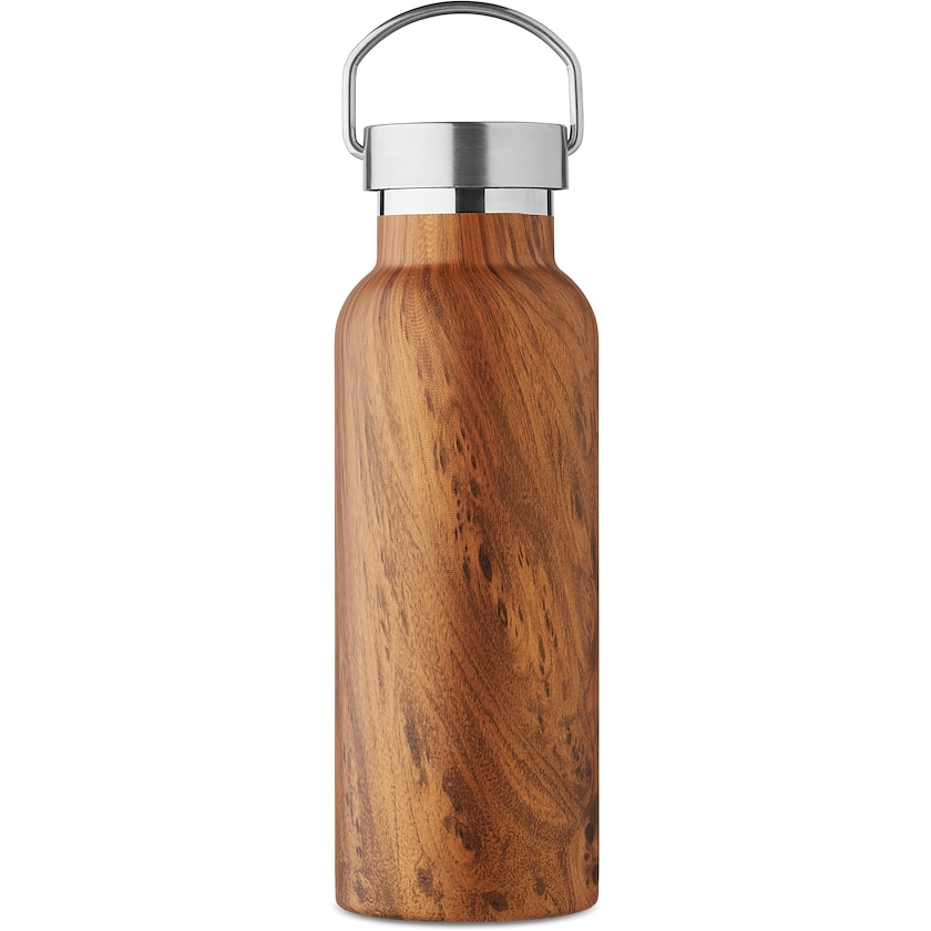 Termoflaske i rustfri stål med træudseende. Stålet er fremstillet af 90% genanvendt rustfri stål og 10% rustfri stål. Termoflasken er lækagefri. Mærkning kan enten laves med tryk eller lasergravering.