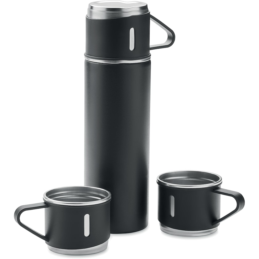 Termoflaske af rustfri stål med hele tre kopper. Termoflasken rummer 42 cl og hver kop 15 cl. Lækagetæt.