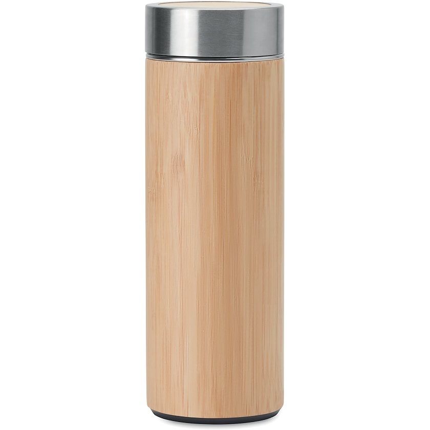 Termoflaske i rustfri stål som er beklædt med bambus. Indvendigt er der en tesi for dig som elsker te. Termoflasken har dobbelte vægge som holder din drikkevare ordentlig varm.