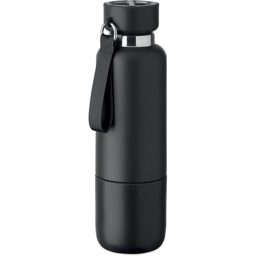 Kompakt termoflaske af genanvendt rustfri stål. Der er et krus i bunden, og låget er udstyret med en strop. Lækagesikker. Lavet af 90% genanvendt srustfrit stål og 10% rustfrit stål.
