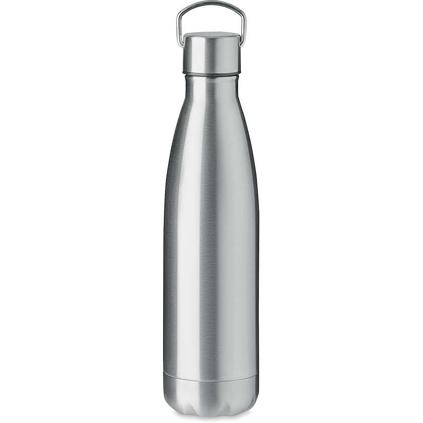 Flot termoflaske i rustfri stål. Vælg mellem tryk og lasergravering. I låget er der et håndtag som gør at termoflasken er let at bære. Lækagetæt.