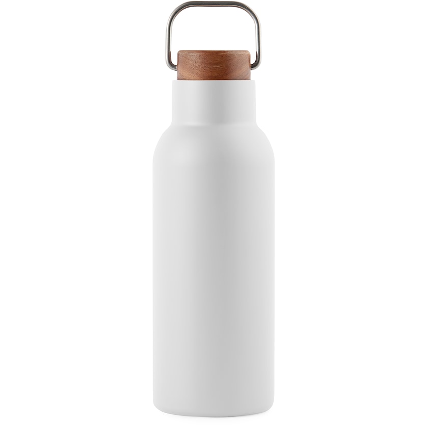 Elegant termoflaske af RCS-certificeret genanvendt rustfri stål. Låget er fremstillet af akacietræ og er forsynet med en løkke af metal. Termoflasken har dobbelte vægge hvilket gør at drikken enten holdes varm eller kolde i lang tid.