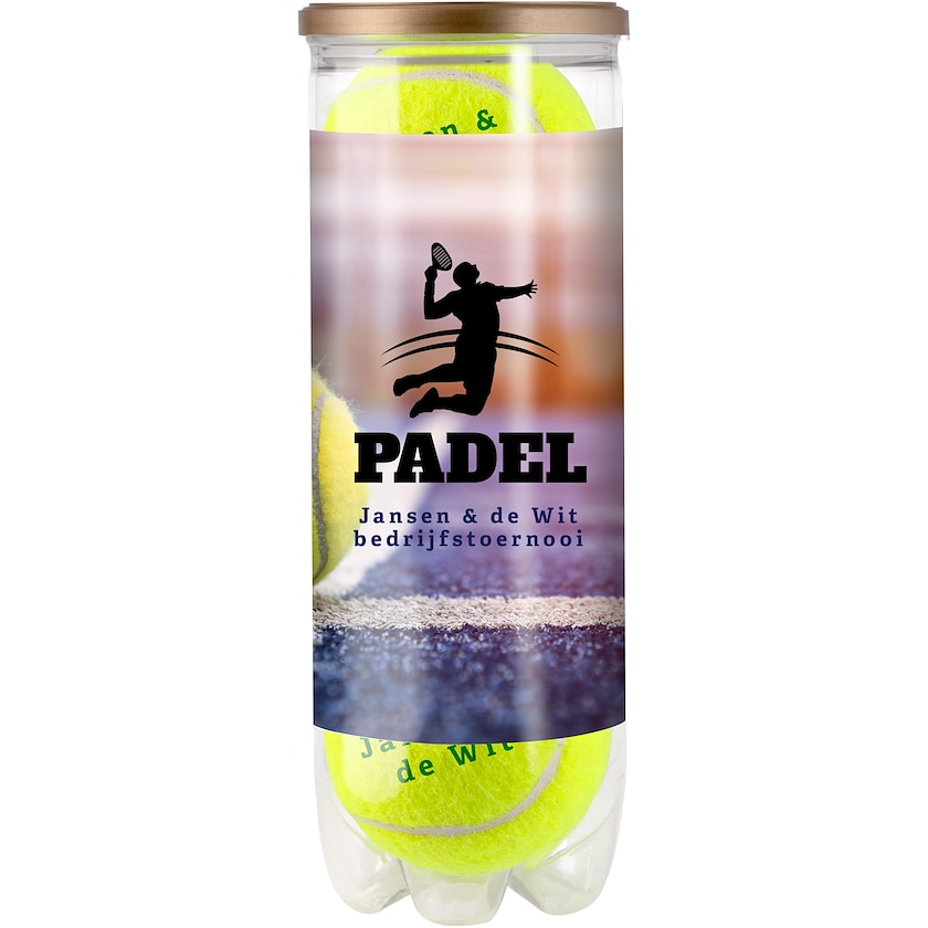 Sæt med tre padelbolde med logo samt etiket i eget design. Trykprisen henviser til tryk på de tre padelbolde samt etiketten. Padelboldene er gasfyldte og fremstillet i Europa.