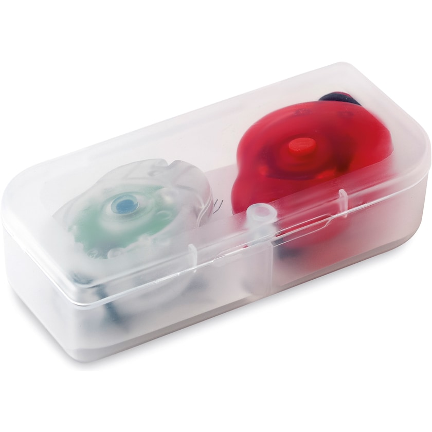 Sæt med cykellygter. Sættet indeholder både for- og baglygte. Cykellygterne drives med to knapbatterier (indkluderet). Leveres i en frostet plastikpose. Trykket laves på plastikposen.