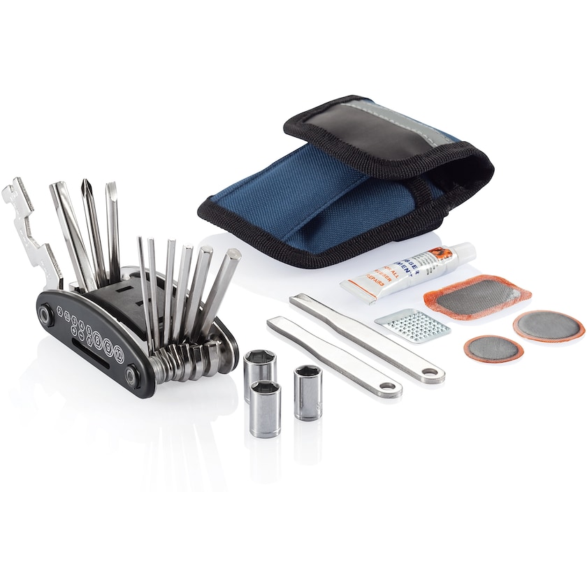 Brugbart reparationskit til cykel. Blå taske som indeholder et praktisk reparationskit til cykler. Indeholder sammenlagt 15 funktionelle dele. Bestil reparationskit til cyklen med tryk hos Axon Profil!