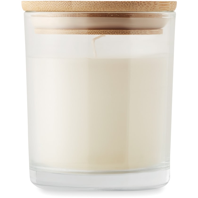 Duftlys i glas med bambuslåg. Spreder en vidunderlig duft af vanilje. Brændetiden er på 20 timer. Leveres i en hvid gaveæske.