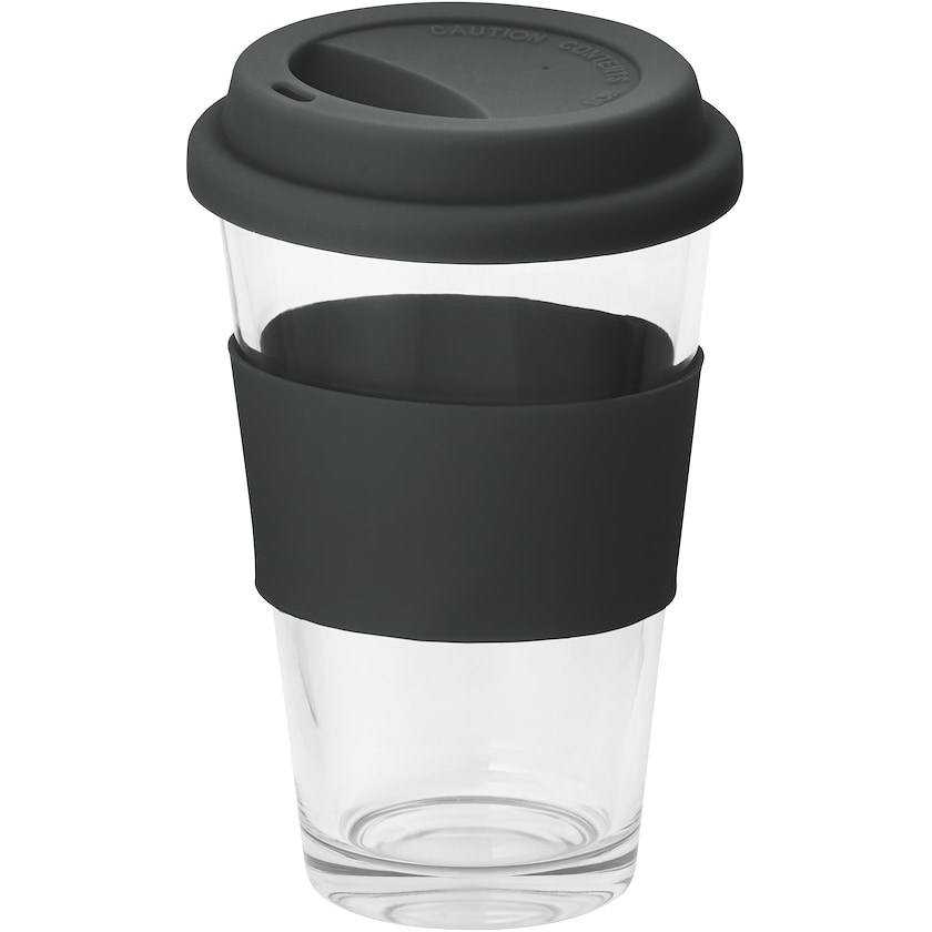Glas med låg og greb i silikone. Takket være grebet passer Perris perfekt til varme drikke. Trykket laves på låget. Kun 1-farvetryk er muligt.