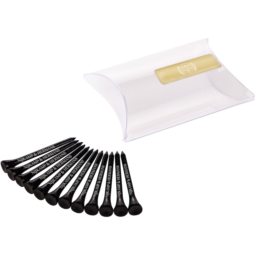 Sæt med 12 stk. golftees i en transparent emballage. Trykprisen inkluderer tryk på alle 12 golftees samt på emballagen.