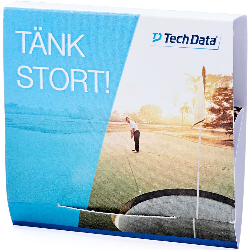 Papemballage med fire golf tees, markeringsmærke samt pitchfork. Vælg frit farve samt 55 eller 70 mm længde for alle golftees. Prisen inkluderer digitaltryk på indpakningens yderside og på golfmarkøren, samt 1-trykfarve på alle golftees. Golfmarkøren har en trykflade på Ø 25 mm og for golftees gælder trykfladen 25 x 4 mm (55 mm tee) samt 34 x 4 mm (70 mm tee). Alle golftees kan alternativt trykkes på toppen hvor der er en maks. trykflade på Ø 9 mm.