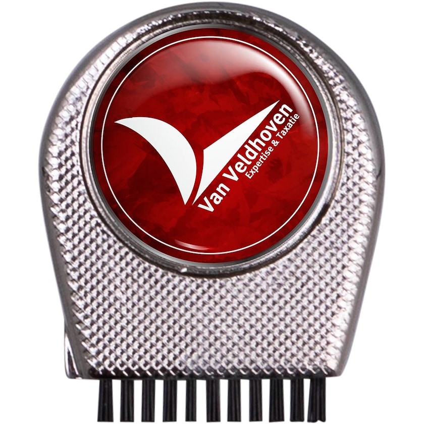 Klubrenser af metal med markeringsmærke. Børsten er fremstillet af nylon. Trykket laves på markeringsmærket og placeres under et beskyttende lag epoxy.