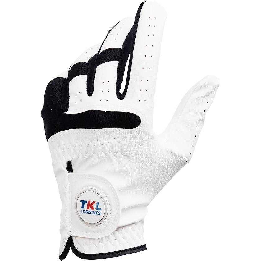 Golfhandske med markeringsmærke. Handsken passer til alle vejrforhold og er forstærket med ekstra skindindlæg ved håndflade og tommelfinger. Det sorte lycra giver handsken ekstra god pasform og åndbarhed. Mærkning laves med digitaltryk på markeringsmærket der sidder fast med en magnet. Bland frit mellem herrehandske venstre/højre i størrelserne S, M, M/L og XL samt damehandske venstre i størrelserne S, M og L.