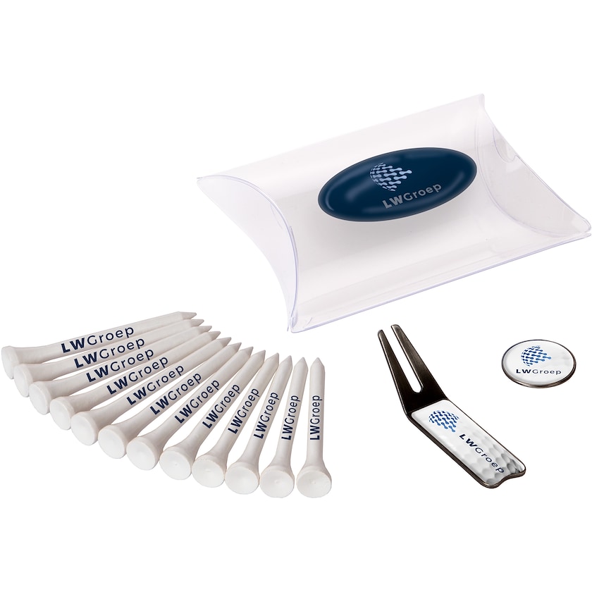 Sæt med golftees, pitchfork og markeringsmærke. Mærkning laves med digitaltryk på emballagen, på markeringsmærket, pitchfork samt på de tolv golftees. Golftees har 70 mm længde og er lavet af bambus.