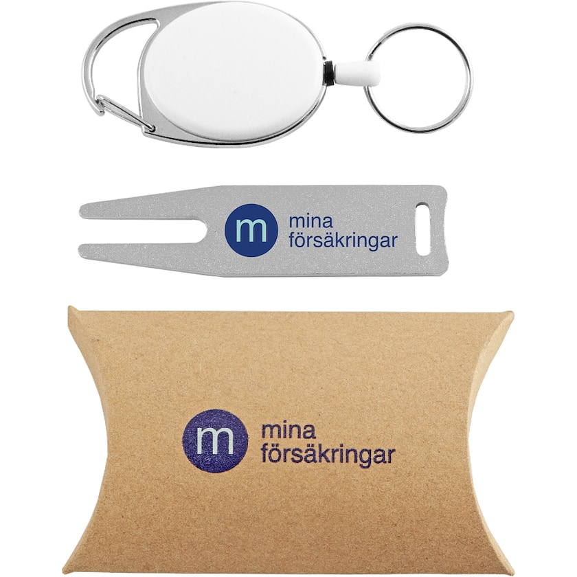 Golfsæt med pitchfork og udtrækkelig nøglering. Trykprisen henviser til tryk på pitchforken, den udtrækkelige nøglering og emballagen.