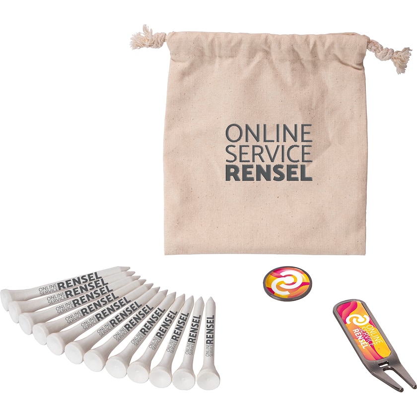 Sæt med golftees, pitchfork og markeringsmærke i bomuldspose. Golftees er 70 mm i længden og fremstillet af træ. Bomuldsposen er fremstillet af økologisk bomuld. Trykprisen inkluderer 1-trykfarve på golftees samt digitaltryk på bomuldsposen, pitchforken og markeringsmærket.