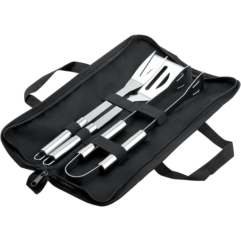 Prisvenligt grillsæt i 3 dele som leveres i praktisk opbevaringsetui. Indeholder grillgaffel, stegepande og tang. Mærkingen sker med tryk på opbevaringsetuiet.