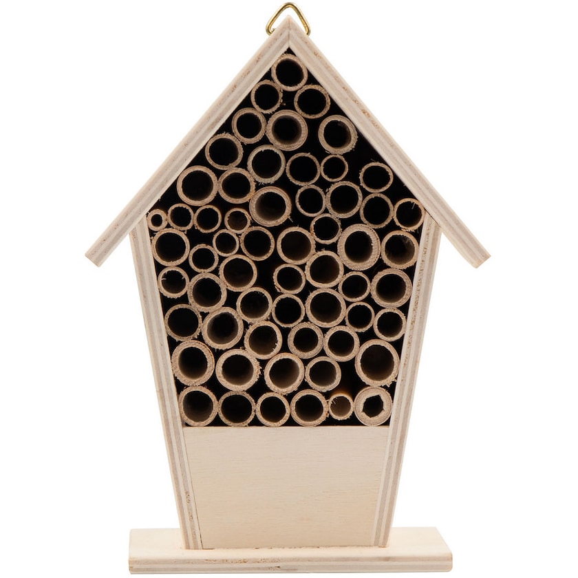 Insekthus til en frodig have. Insekthuset er lavet af krydsfiner og siv. Mærkning sker med lasergravering.