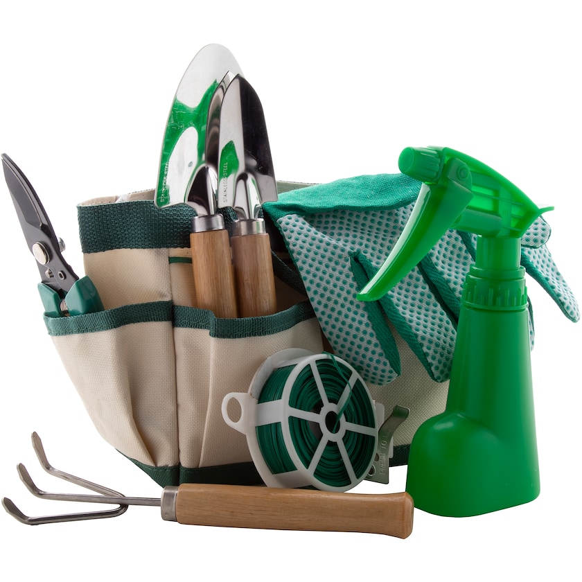 Sæt med alt der behøves til havdearbejde. Sættet indeholder foruden tasken en havesaks, en greb, to spader, havetråd med kniv, en sprayflaske og et par havehandsker.