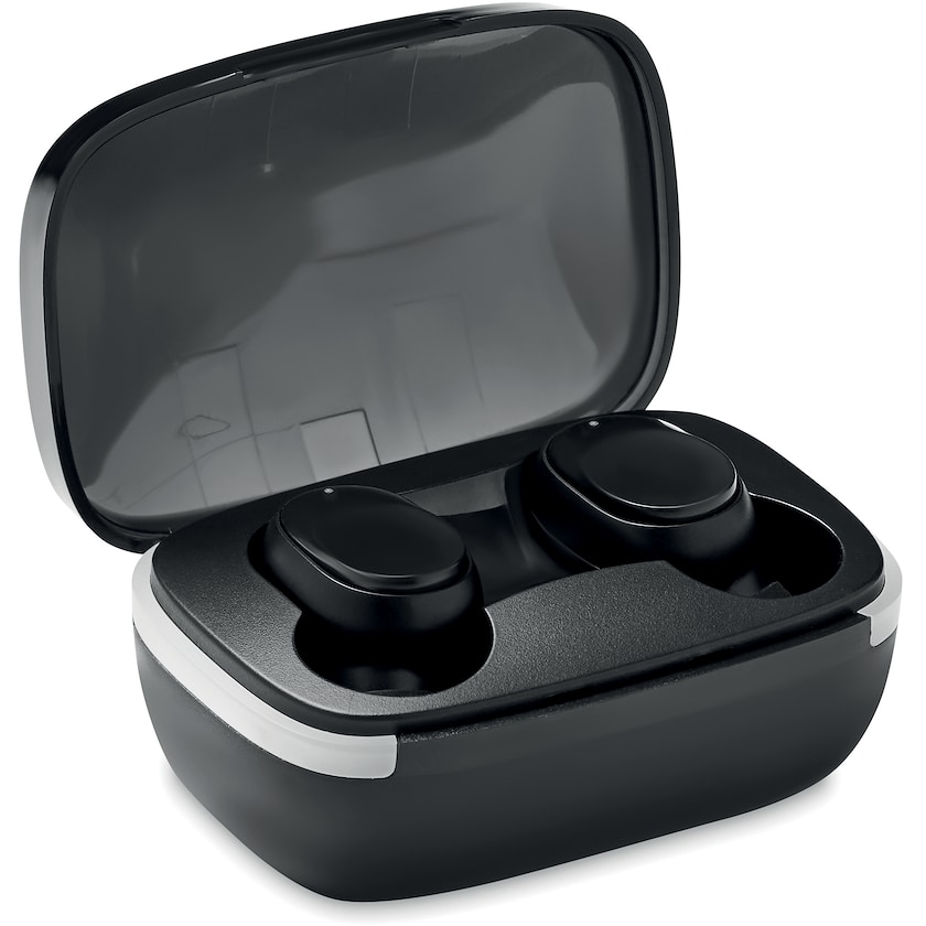 Sæt med trådløse høretelefoner. Høretelefonerne er af typen True Wireless Stereo 5.0. Spilletiden er ca. 3 timer. Mikro-USB-kabel inkluderet. Etuiet fungerer også som opladerstation.