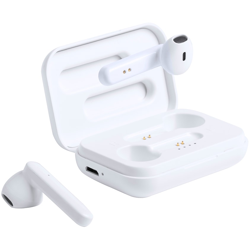 Trådløse høretelefoner i etui. Høretelefonerne oplades i etuiet. Opladningskabel medfølger.