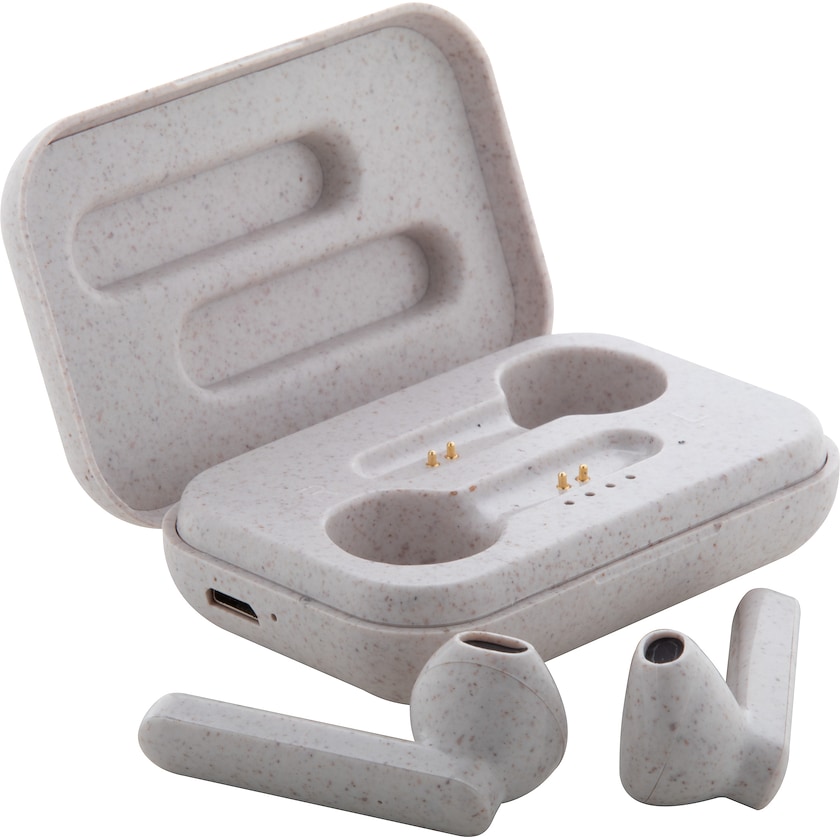 Miljøvenlige trådløse høretelefoner med logo. Higginsport er fremstillet af økologisk hvedehalm. USB-opladerkabel følger med. Leveres i en naturfarvet papæske.