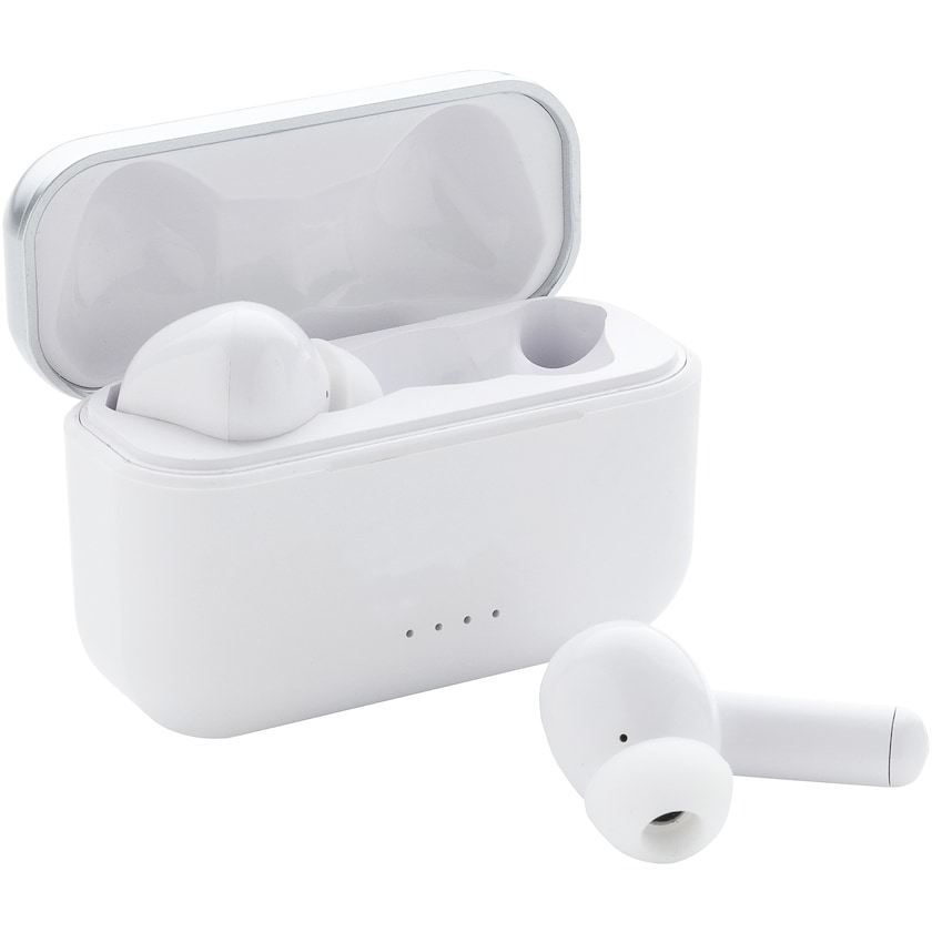 Trådløse høretelefoner med den nyeste teknik. Høretelefonerne oplades i det medfølgende opbevaringsetui. Batteriet oplades på 1,5 time via USB-C udgangen. Opbevaringsetuiet kan også oplades ved at placere det på en trådløs ladeplade. Spilletiden er 6 timer ved medium lydstyrke, og standbytiden er 40 timer. Leveres med silikoneørepropper i tre størrelser.