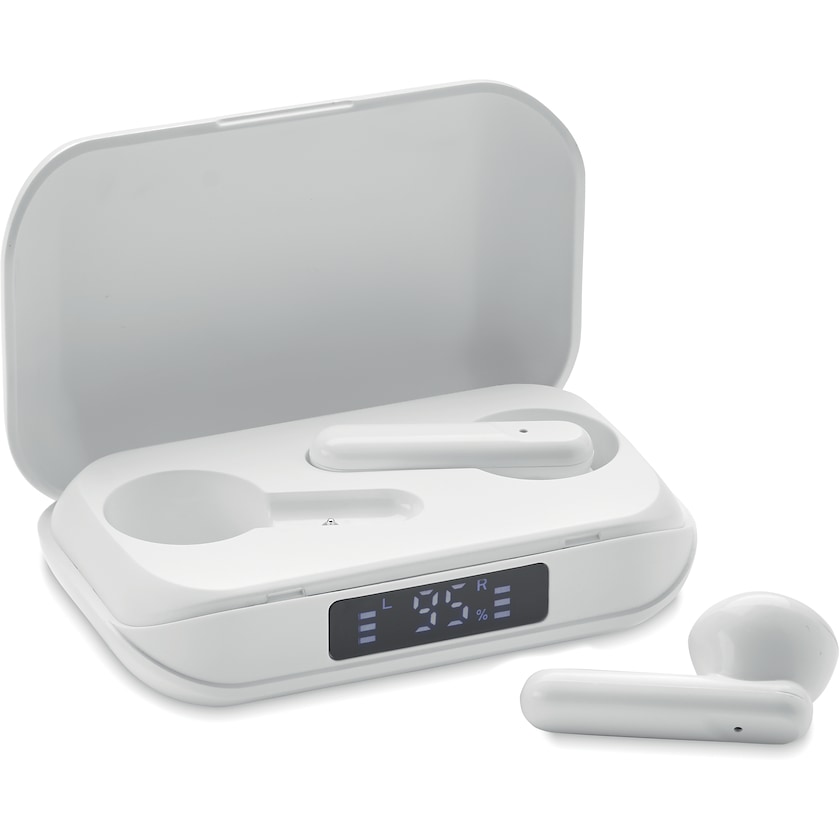 Trådløse høretelefoner i genbrugs ABS. Høretelefonerne har stereolyd, indbygget mikrofon og LCD-display som viser opladningsniveau. Automatisk parring. Type C-opladningskabel samt opladningsstation er inkluderet.