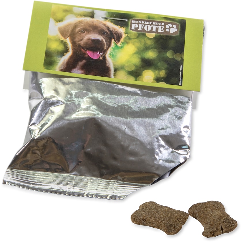 Pose med hundesnacks forsynet med et kort med eget tryk. Kortet trykkes helt efter dine ønsker. Hundesnacken er fra varemærket Happy Dog og passer til hunde fra 4 måneder.