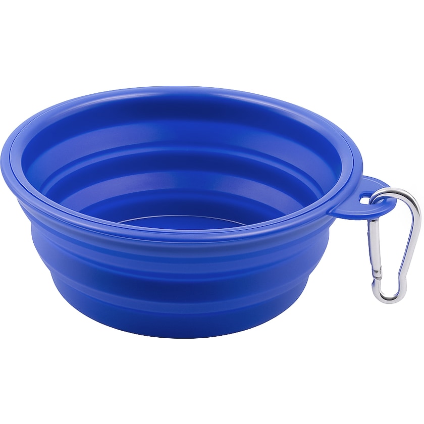 Foldbar hundeskål med karabinhage. Pga. hundeskålen kan foldes sammen tager den kun lidt plads når den ikke er i brug.