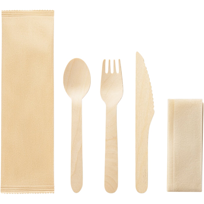 Engangsbestik i træ. Indeholder gaffel, kniv, ske samt serviet. Leveres individuelt pakket i en naturfarvet papemballage. Mærkning laves med digitaltryk på en etiket som placeres på emballagen. perfekt til firma eventet!