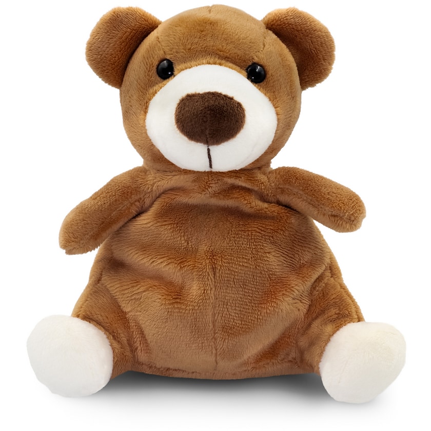 Bamse lavet af blød plys. Trykket laves på maven. Takket være små bolde indeni kan bamsen sidde op.