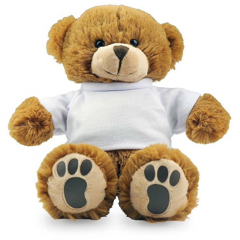Miljøvenlig bamse med hvid t-shirt med eget logo. Bamsen er fremstillet i rPET, dvs. genbrugte PET-flasker. Trykket laves på t-shirten som leveres separat fra bamsen. Bamsen har GRS-certifikat. En krammebamse som desuden er god mod naturen.