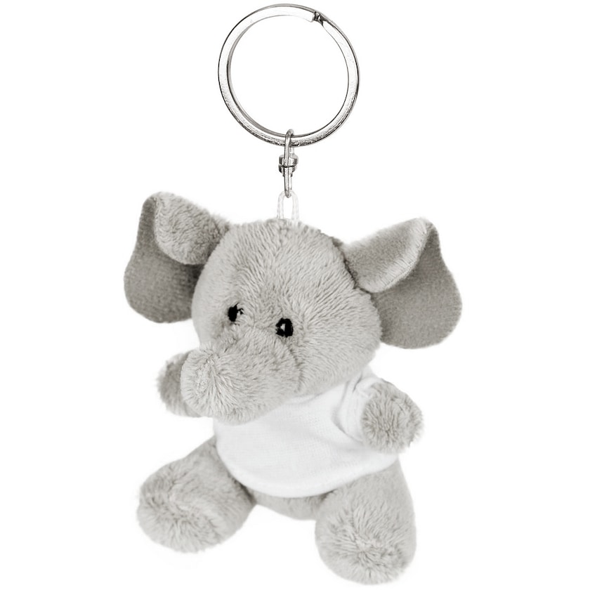 Sød elefant med nøglering. Elefanten har en hvid t-shirt, hvor trykket sker. T-shirten leveres separat fra bamsedyret.