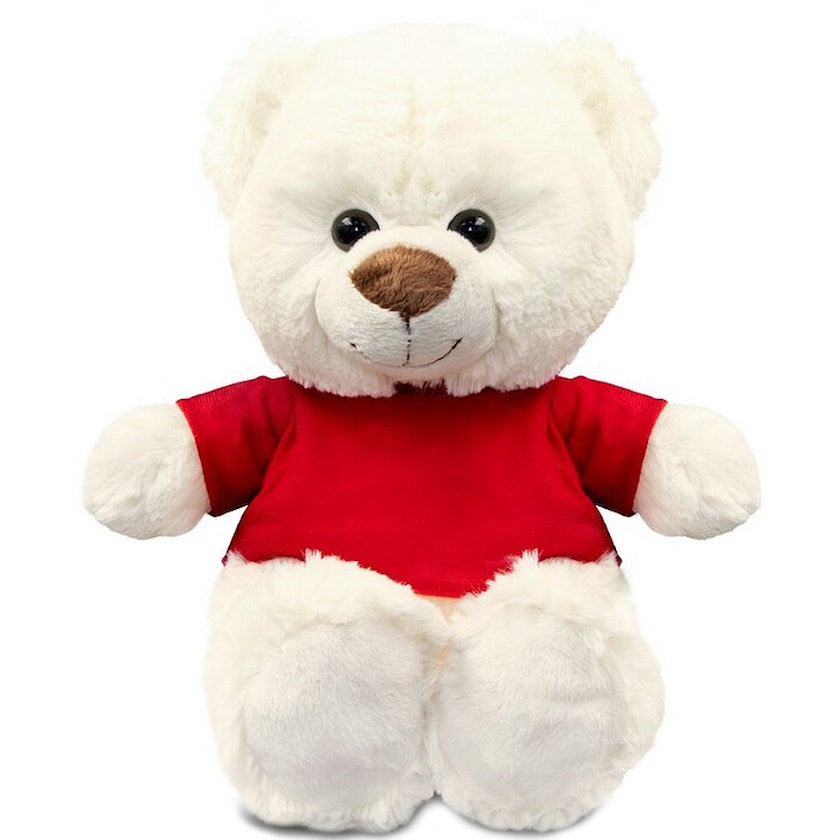 Stor, hvid legetøjsbamse med rød trøje. Bamsen har en højde på hele 27 cm. T-shirten leveres separat fra bamsen.