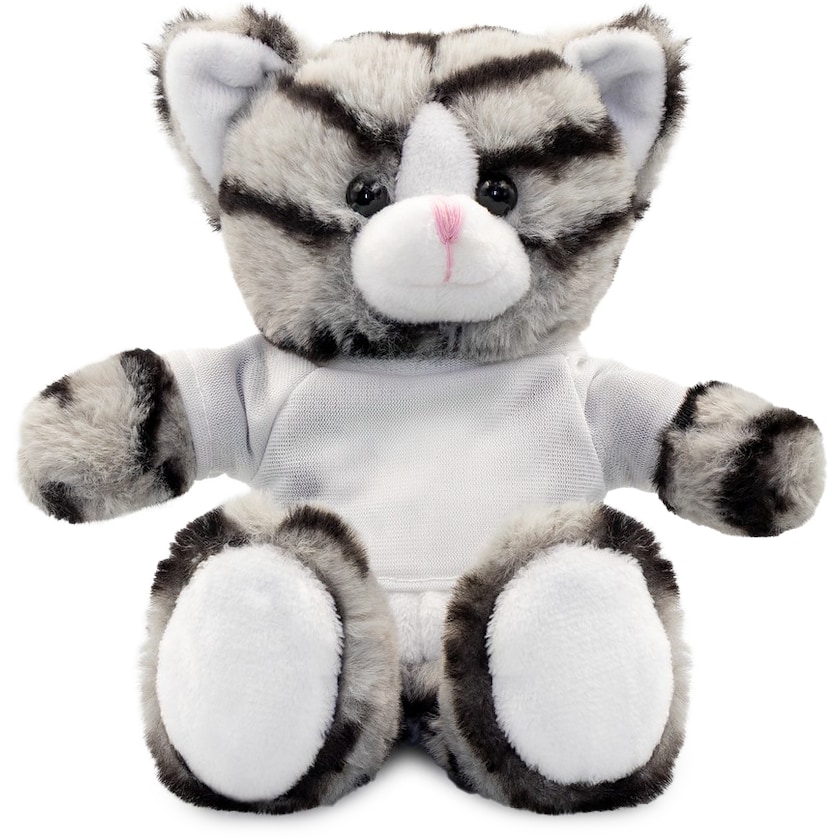 Fræk kat med trykbar t-shirt. Bamsedyret er 16 cm høj. T-shirten leveres separat. Bestil kattebamsen med logo!