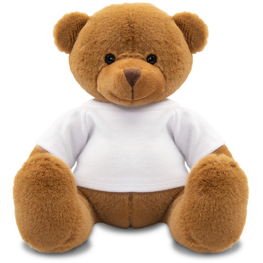 Sød bamse med hvid trykbar t-shirt. Bamsen Teddy er fremstillet i plys og er 17 cm høj. T-shirten leveres separat fra bamsen.