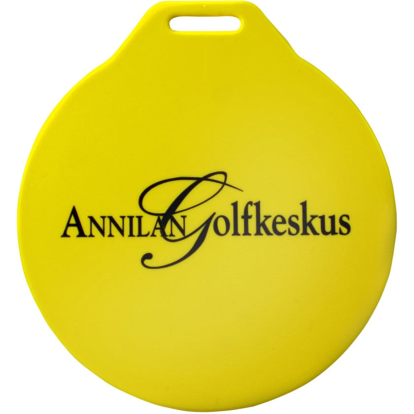 Stor rund kuffertmærke i kraftig plast med stor trykflade. Sort eller hvid rem medfølger.