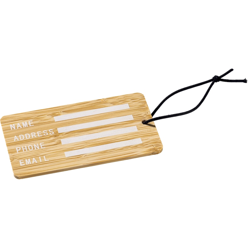 Kuffertmærker af bambus. Kuffertmærken har felter hvor du kan udfylde med navn, adresse, telefon og email. Kun 1-trykfarve er mulig.