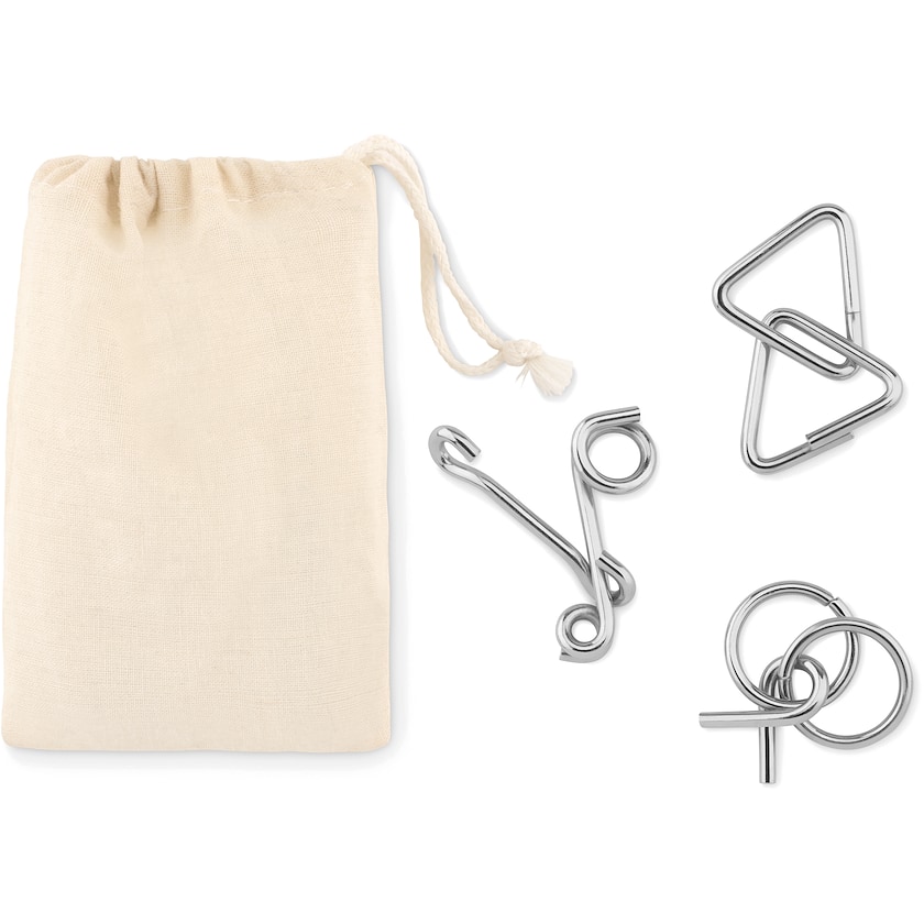Herligt sæt med 3 øvelser der træner hjernen. Sættet leveres i en naturfarvet bomuldspose. Trykket laves på bomuldsposen.