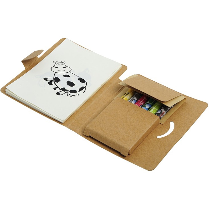Farvelægningssæt med farveblyanter og farvelægningssider. Sættet indeholder 8 stk. farvelægningssider, 6 farveblyanter og 25 stk. tegnepapir. Omslaget er lavet af ubehandlet pap og på forsiden findes der en sjov smiley.