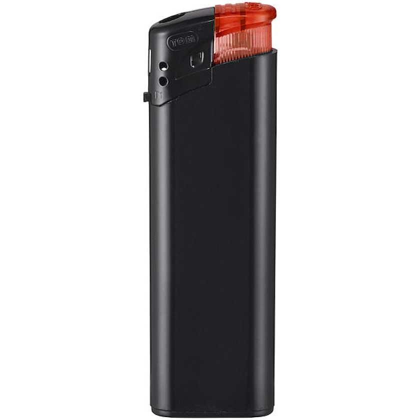Sort elektronisk lighter med farvet gennemsigtig tændknap. Justerbar flamme. Lighteren er TÜV-certificeret og sikkerhedstestet.