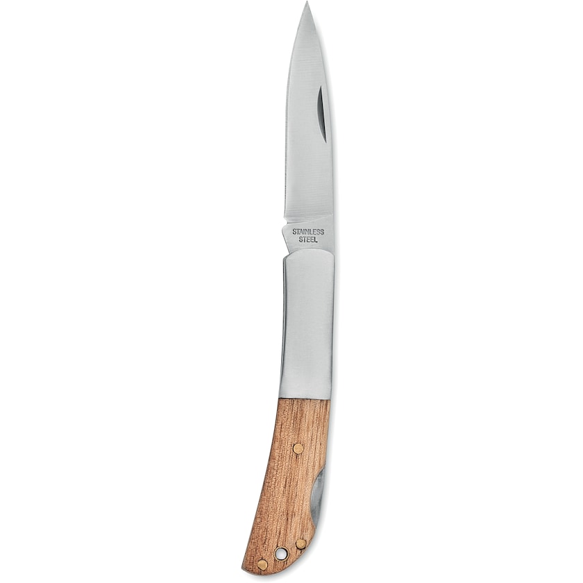 Lommekniv af rustfri stål og skaft af akacietræ. Bladets længde er på 6 cm.
