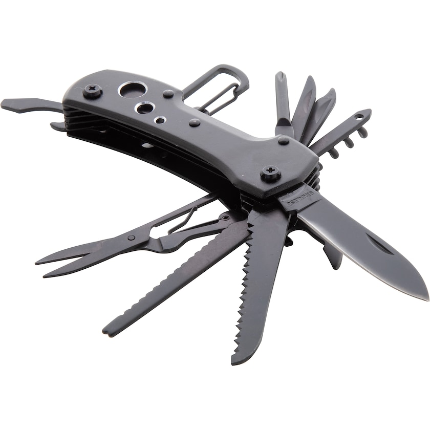 Hel sort lommekniv med 13 funktioner. Elburn er lavet af rustfri stål, foruden skaftet som er fremstillet i aluminium. Mærkning kan enten laves med lasergravering eller 2-trykfarver.